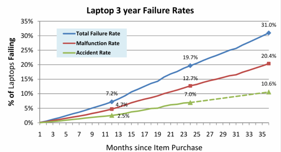 Warranties are not a fear purchase, nor an upsell. When you look at the data, you see that laptop failure rates are significant within a three-year window. And regardless of what the cause of the failure is, standard refurbished laptop warranties don't cover any of it.