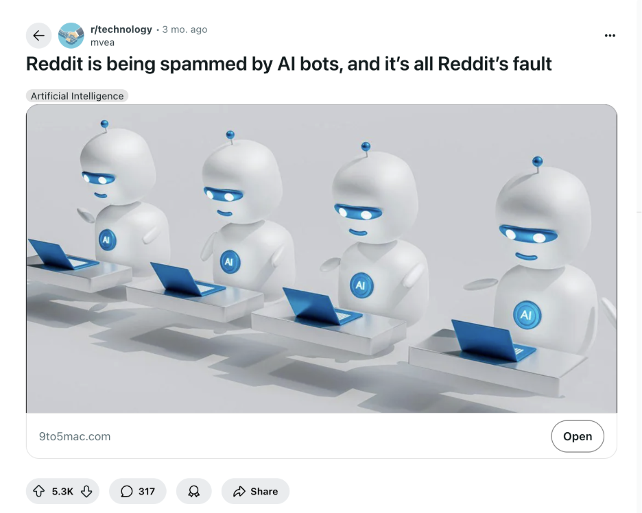 Three months ago, a thread in r/technology titled “Reddit is being spammed by AI bots, and it’s all Reddit’s fault” blew up with more than 5.3K upvotes and hundreds of comments.