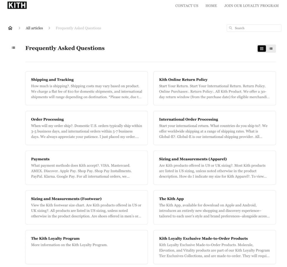 While you don’t need to create an entire help center, having the information spread across and on an FAQ page will save you a lot of time and money in the future. For example, the FAQ page by KITH does a great job at answering queries without a ton of snazzy tech.