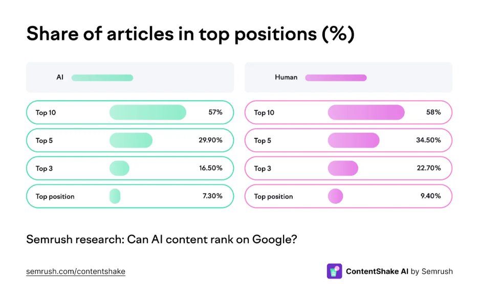 As per a study done by SEMrush (after analyzing 20k articles) there is a gap in rankings between AI and human written content, but it’s not as vast as you may think.