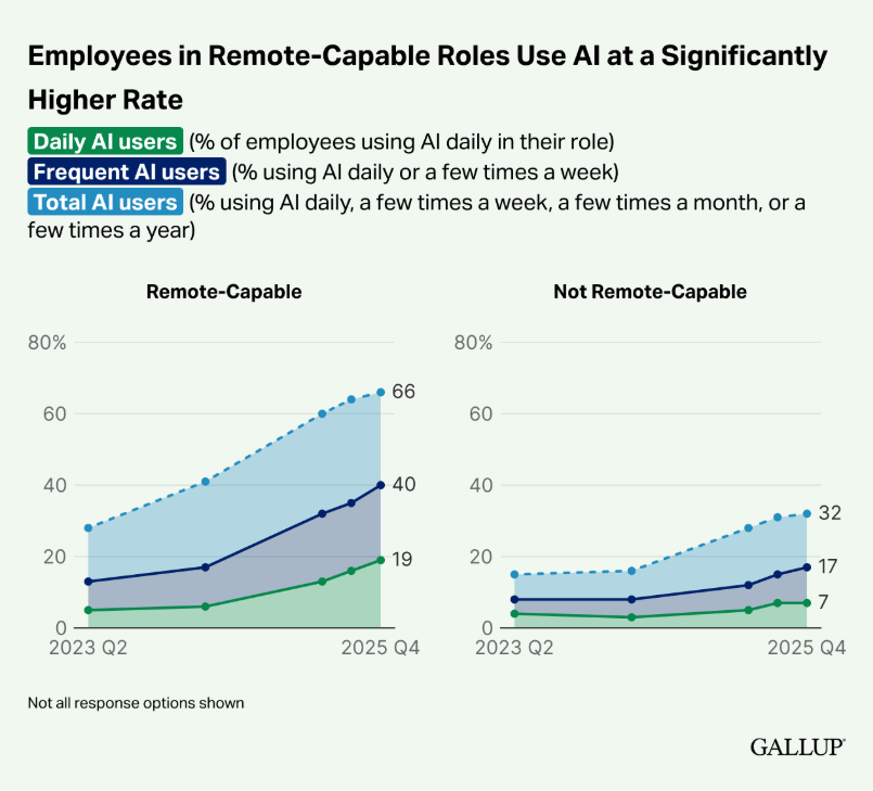 And it worked, Gallup says AI use in remote-capable jobs in the U.S. reached 66% by 2025, with 40% using it frequently.