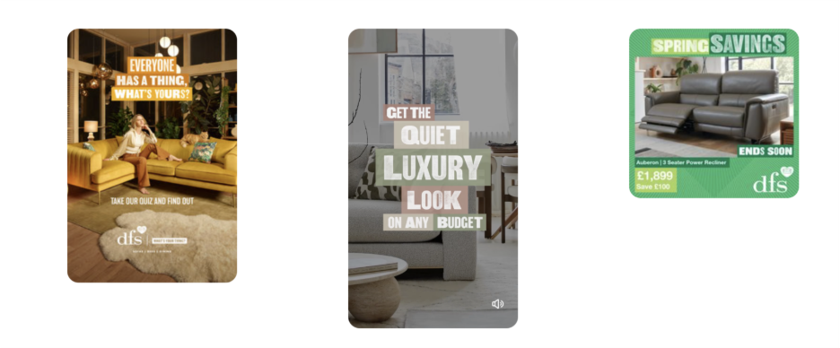 DFS, one of the UK’s largest furniture retailers, built a campaign that followed shoppers from dream to decision. They used full-room videos, Idea and Quiz ads, and Shopping ads each tailored to keep the shoppers engaged.
