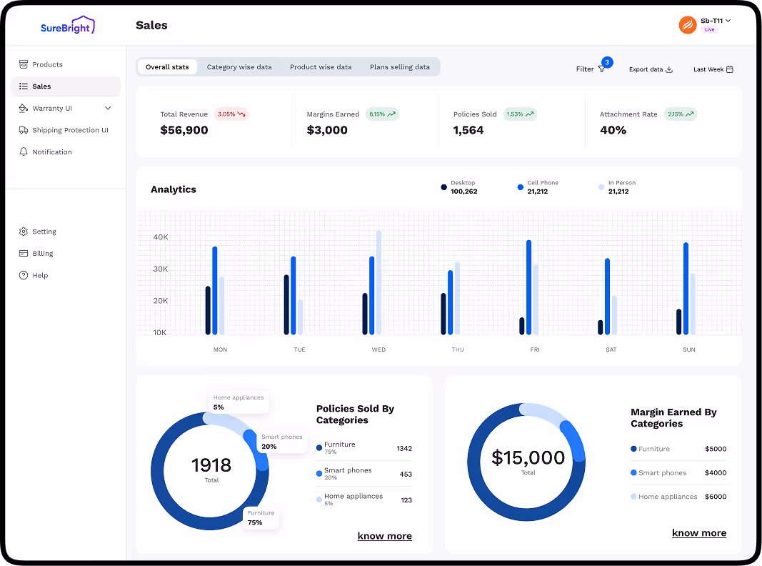 Yes, once onboarded, SureBright will set up a custom merchant dashboard for you. You can simply log into the dashboard, which provides key metrics including the number of warranty policies sold, revenue generated from warranties, and the percentage of customers purchasing warranties. This gives you complete flexibility to monitor your warranty program's performance.