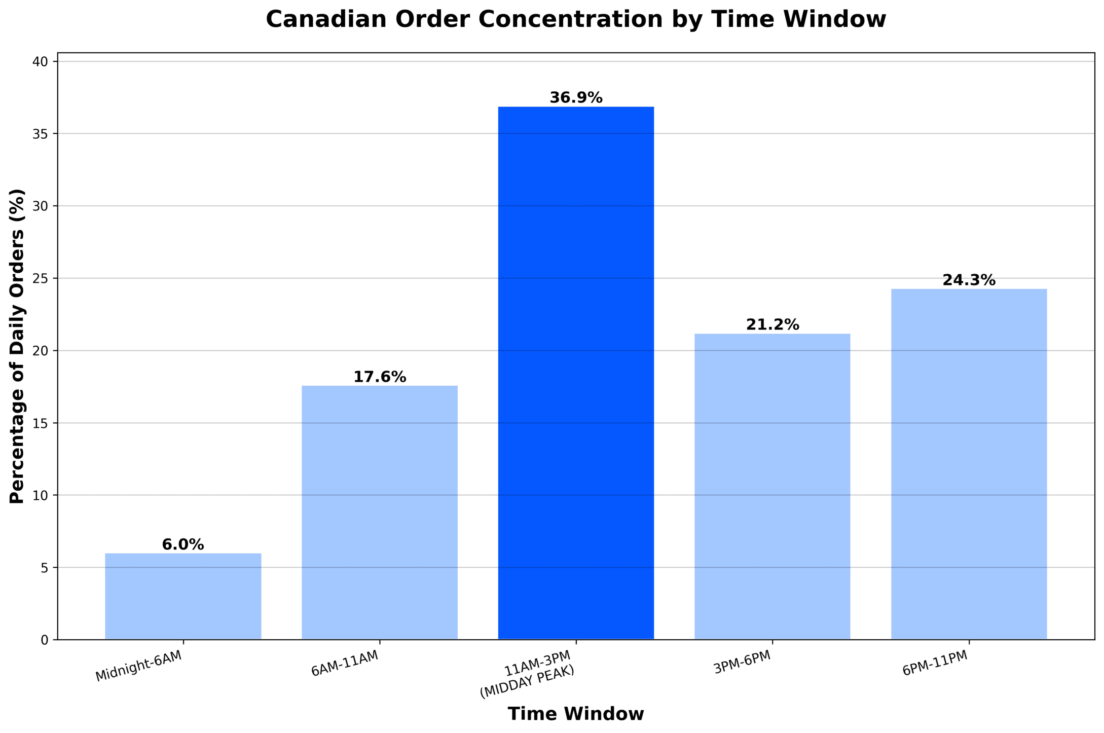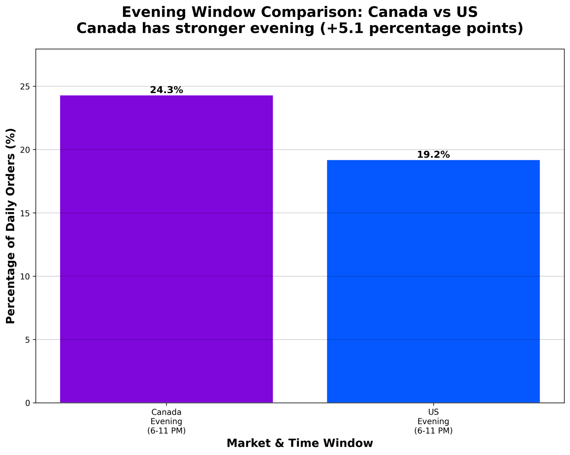 Canada-Specific Adjustment: Canadian evening hours (6-11 PM) capture 24.3% of daily orders, making them the second-strongest time window after midday. This is substantially higher than the US evening contribution of 19.2% and requires maintaining elevated campaign presence through evening hours.