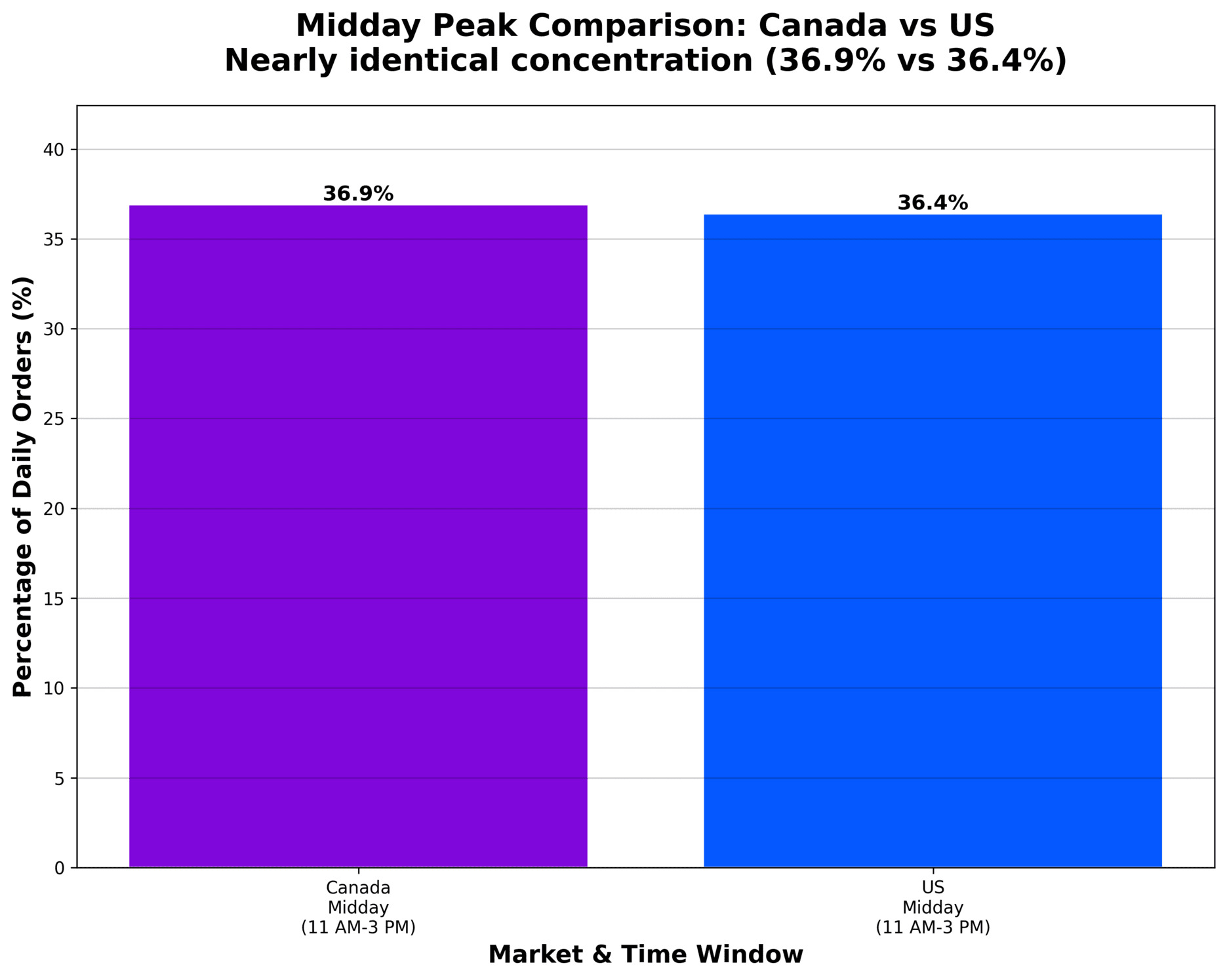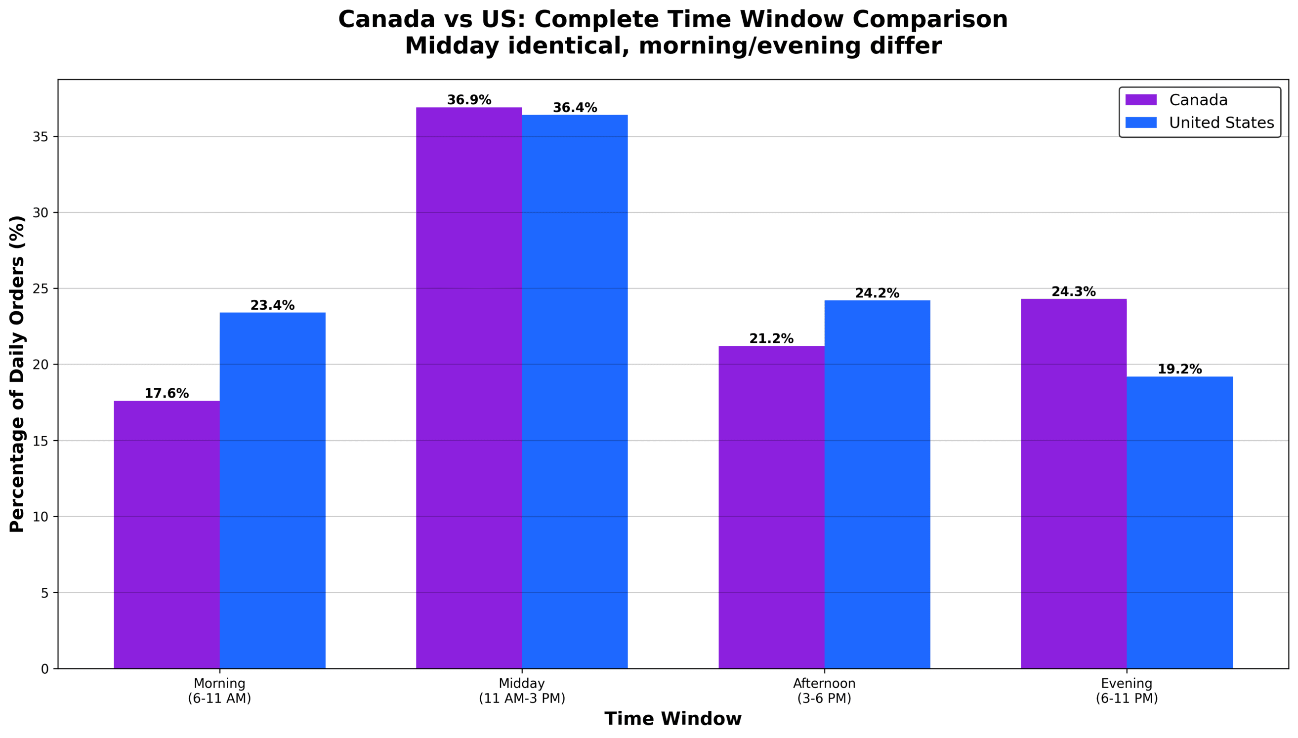 The 0.5 percentage point difference between Canada (36.9%) and the US (36.4%) in the midday window is effectively negligible. Both markets concentrate slightly over one-third of their daily orders in the four-hour 11 AM-3 PM slot. This consistency means that cross-border merchants can use midday as a unified target without material market-specific adjustments.