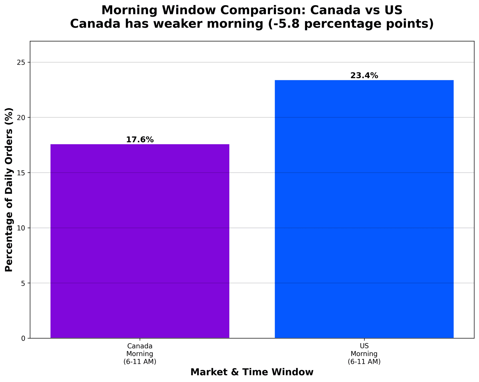 This doesn't mean ignoring morning entirely - 17.6% of daily orders still occur in the morning window. But it does mean recognizing that early-morning campaigns in Canada face lower absolute opportunity than they do in the US. The 9:00 AM hour in Canada captures 4.8% of daily orders; in the US it captures 5.8%. That's a 17% difference in addressable market at that specific hour.