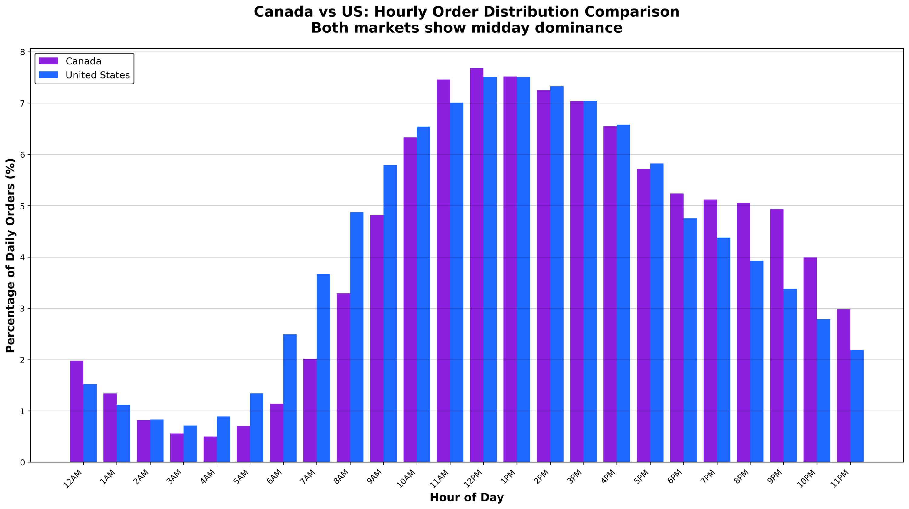 Where Canada diverges most noticeably from the US is in evening behavior. From 6:00 PM through 11:00 PM, Canadian orders represent 24.3% of daily volume compared to 19.2% in the US - a 5.1 percentage point difference. Canadian evening hours don't decline as sharply as US evening hours. The 7:00 PM, 8:00 PM, and 9:00 PM hours each maintain above 5% share, whereas US evening hours drop more rapidly after 6:00 PM.