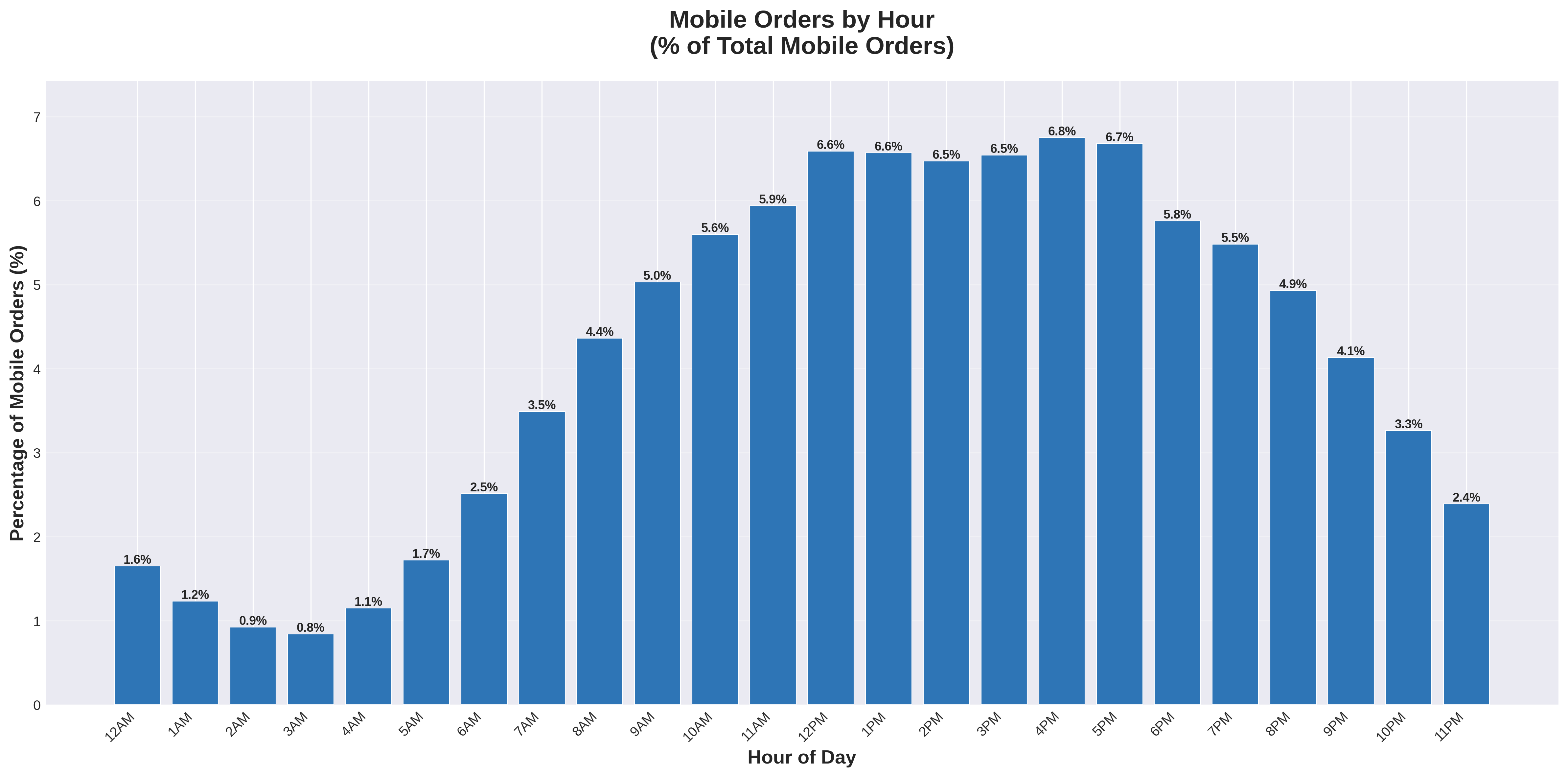 Mobile orders show their highest concentration at 4:00 PM, capturing 6.8% of all mobile orders in that single hour. This is notably later than the overall peak at noon. Mobile participation in the midday peak is strong, but mobile's maximum occurs in the late afternoon as users transition away from desk-based environments.