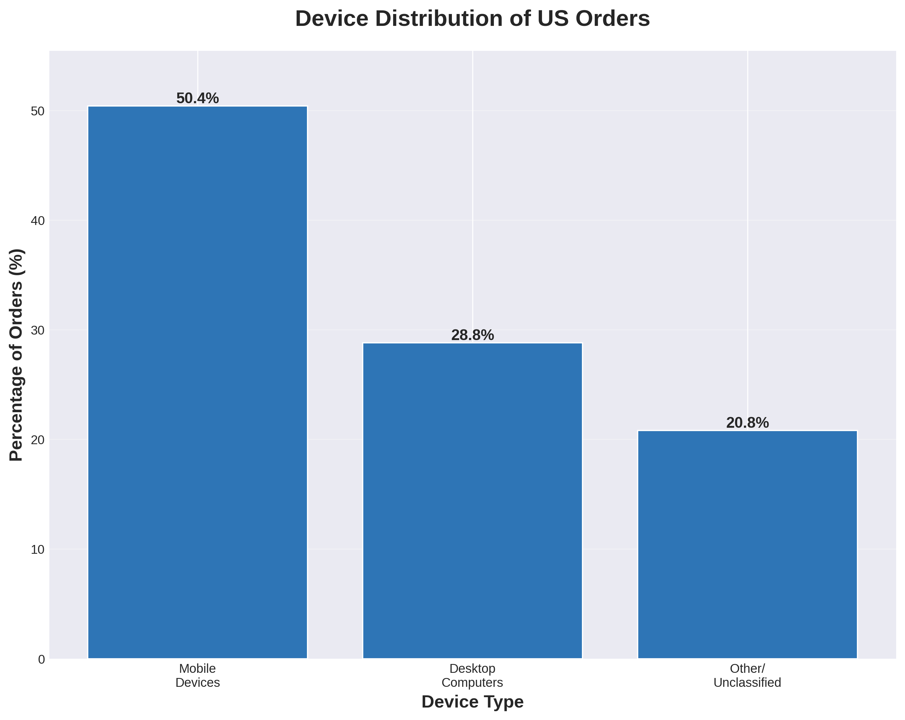 Mobile is the dominant channel, accounting for 50.4% of all US orders. Desktop represents 28.8%, with the remaining 20.8% attributed to devices that could not be definitively classified or represented tablets and other form factors. This distribution establishes mobile as the majority channel - any strategy that treats desktop as primary is fundamentally misaligned with market reality.