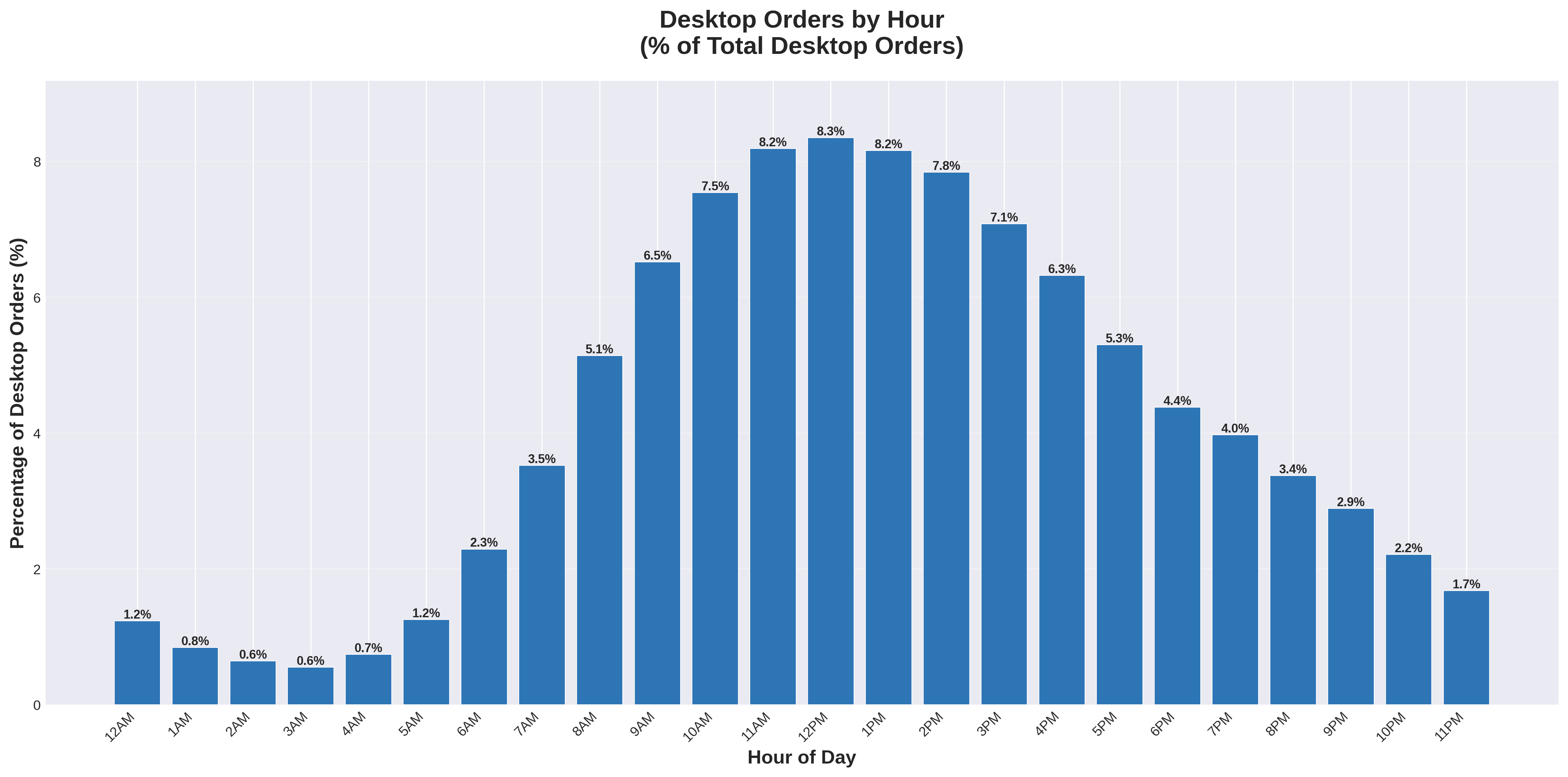 Desktop orders peak sharply at noon, with 8.3% of desktop orders occurring in that single hour - a higher peak concentration than mobile's 6.8% at 4 PM. Desktop ordering is tightly clustered in the 11:00 AM to 2:00 PM window, aligning precisely with traditional lunch hours and midday work breaks.