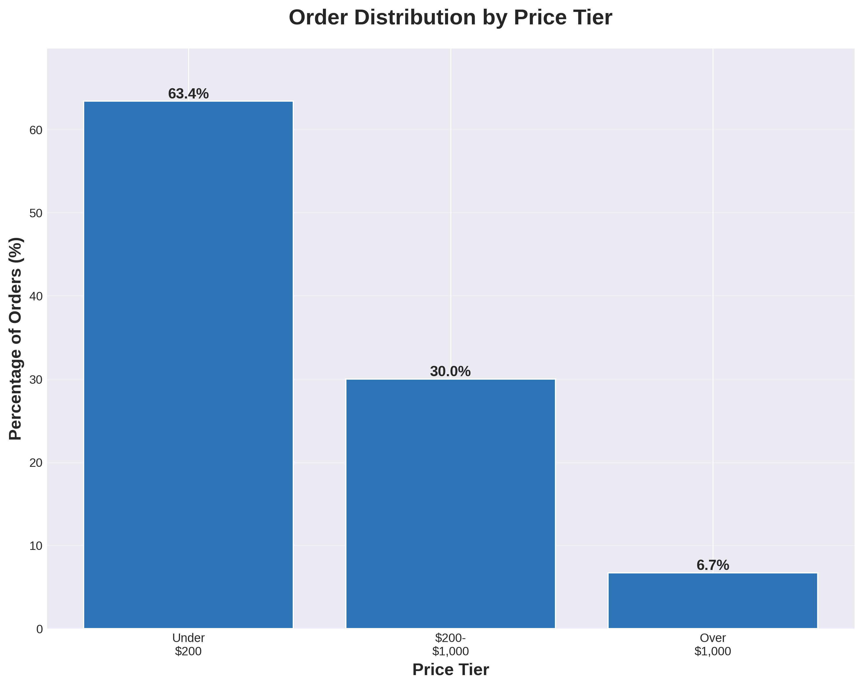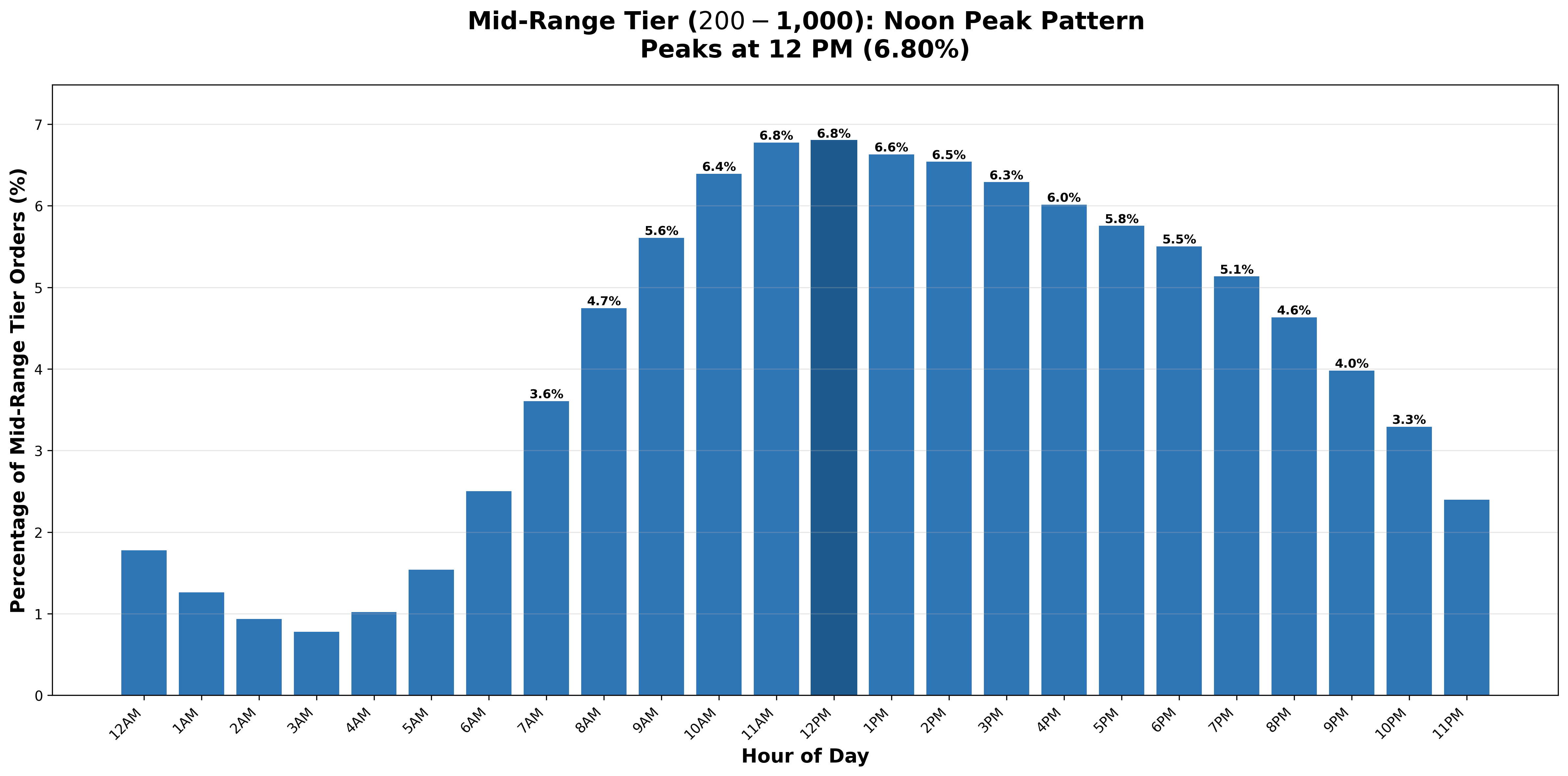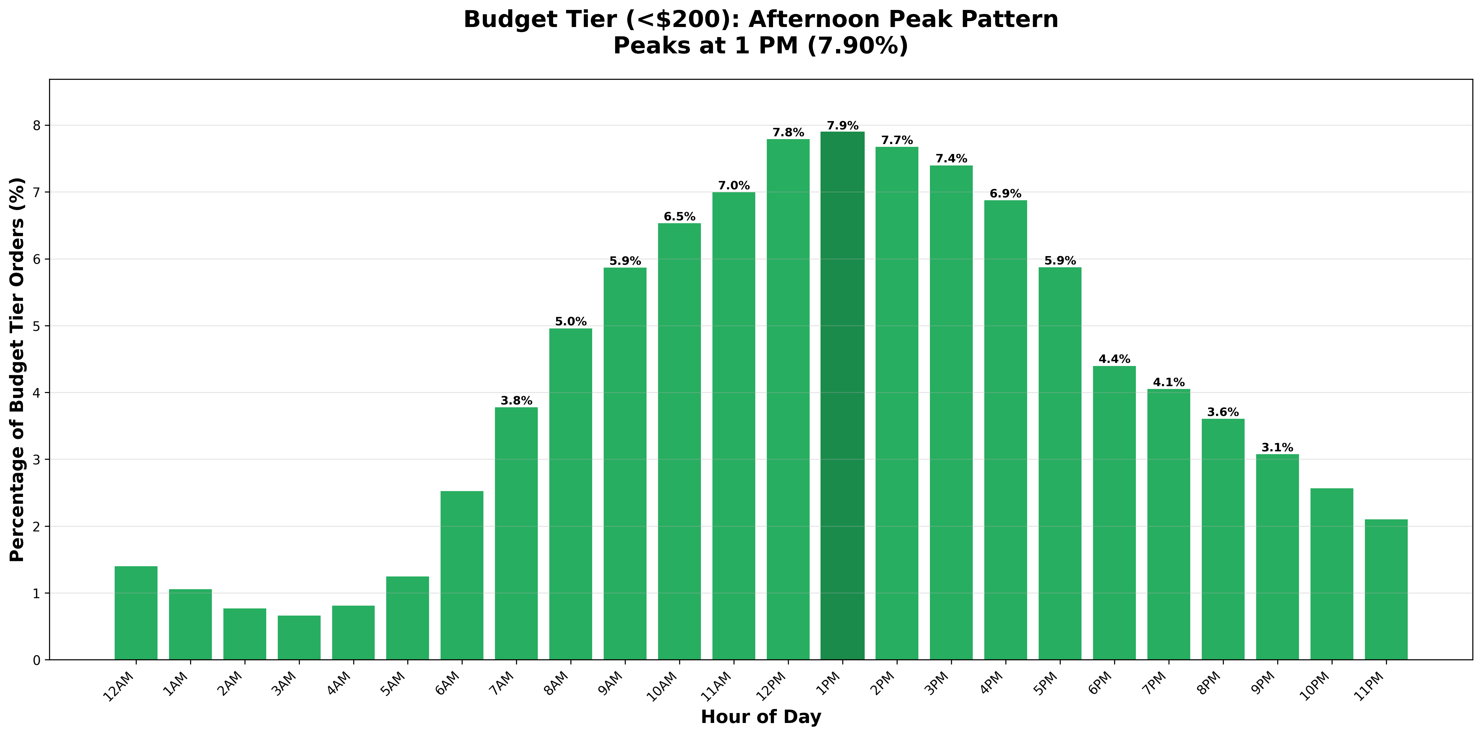 Budget purchases under $200 represent nearly two-thirds of all orders (63.4%) and follow the general midday pattern, peaking at 1:00 PM. Mid-range purchases in the $200-$1,000 tier account for 30.0% of orders and peak at noon - one hour earlier than budget purchases. Premium purchases over $1,000 represent 6.7% of orders and peak at 11:00 AM - two full hours before the budget-tier peak.